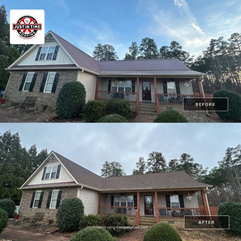 “Just In Time Roofing & Restoration was the best choice we could have made! Very friendly staff and very quick work! We were definitely well taken care of with them! The red roof is the one that needed to be replaced and we got a beautiful charcoal roof in place of it!”